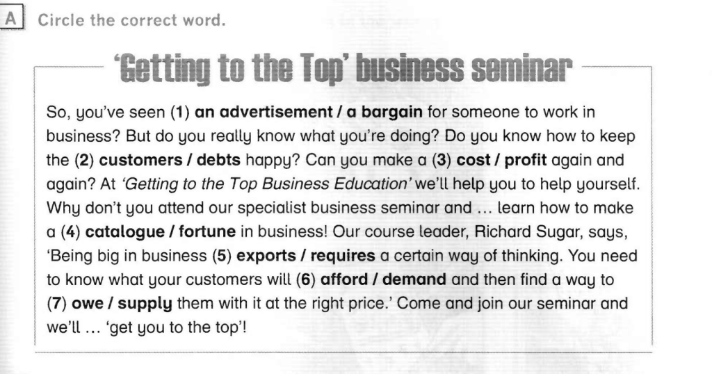 o, you’ve seen an advertisement for someone to work in business. But do you really know what you’re doing? Do you know how to keep the customers happy? Can you make a profit again and again? At ‘Getting to the Top Business Education’ we’ll help you to help yourself. Why don’t you attend our specialist business seminar and learn how to make a fortune in business! Our course leader, Richard Sugar, says, ‘Being big in business requires a certain way of thinking. You need to know what your customers will demand and then find a way to supply them with it at the right price.’ Come and join our seminar and we’ll get you to the top!
